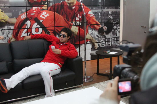 SK와이번스 모바일 적립카드 홍보 영상 촬영 중인 최정의 모습.