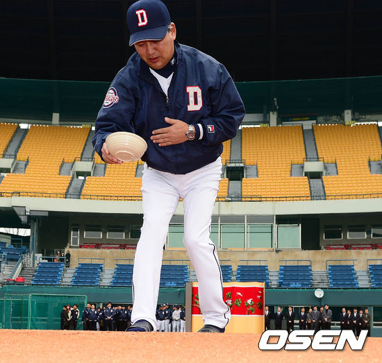 28일 오전 서울 잠실구장에서 열린 두산 베어스의 2013시즌 우승 및 안전 기원제에서 김진욱 감독이 마운드에 막걸리를 뿌리고 있다.
