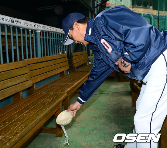 28일 오전 서울 잠실구장에서 열린 두산 베어스의 2013시즌 우승 및 안전 기원제에서 김진욱 감독이 덕아웃에 막걸리를 뿌리고 있다.