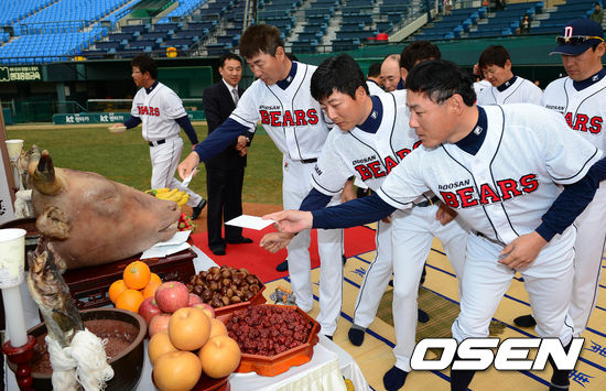 28일 오전 서울 잠실구장에서 열린 두산 베어스의 2013시즌 우승 및 안전 기원제에서 코칭 스텝들이 고사를 지내고 있다.