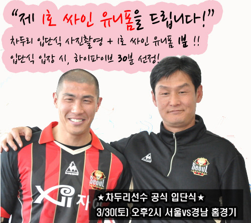 이에 서울은 30일 오후 2시 경남전 홈경기에서 펼쳐지는 공식 입단식 행사에 차두리를 기다려온 팬들을 위한 깜짝 이벤트를 준비했다. 서울 공식 페이스북 이벤트에 참여하는 팬들 중 1명을 선정해 공식 입단식 시, 꽃다발 증정과 사진촬영, 그리고 '차두리 1호 사인유니폼'을 증정해 평생 추억권을 가지게 되는 동시에 국내 축구팬들을 대표로 서울에 입단한 차두리선수를 환영할 예정이다.