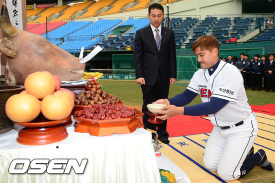 28일 오전 서울 잠실구장에서 열린 두산 베어스의 2013시즌 우승 및 안전 기원제에서 홍성흔이 고사를 지내고 있다.