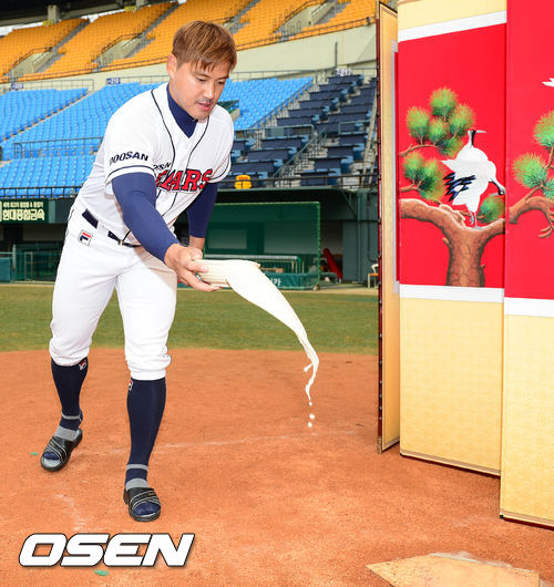 28일 오전 서울 잠실구장에서 열린 두산 베어스의 2013시즌 우승 및 안전 기원제에서 홍성흔이 고사를 지내고 있다.