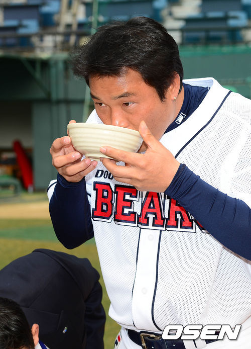 28일 오전 서울 잠실구장에서 열린 두산 베어스의 2013시즌 우승 및 안전 기원제에서 김동주가 음복을 하고 있다.