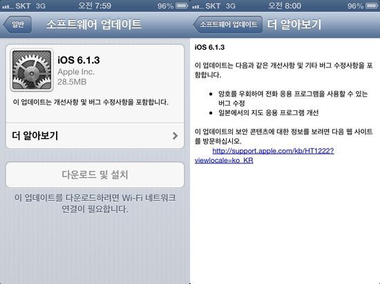 애플은 20일 잠금장치 화면 보안을 강화한 iOS6.1.3 버전을 배포했다. 그러나 배포 하루 만에 다른 보안문제가 제기된 데 이어, 이번엔 배터리와 와이파이 연결 문제가 드러난 것이다.
