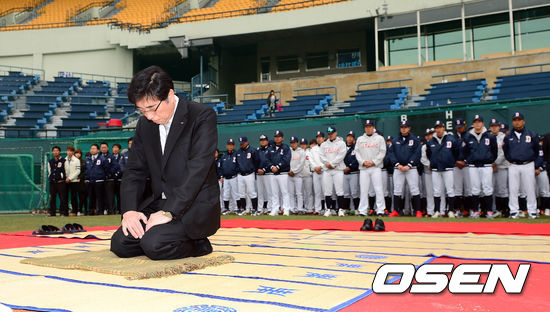 28일 오전 서울 잠실구장에서 열린 두산 베어스의 2013시즌 우승 및 안전 기원제에서 김승영 사장이 고사를 지내고 있다.