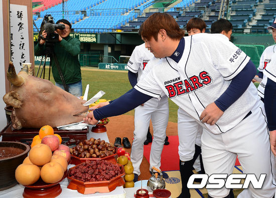 28일 오전 서울 잠실구장에서 열린 두산 베어스의 2013시즌 우승 및 안전 기원제에서 최준석이 고사를 지내고 있다.