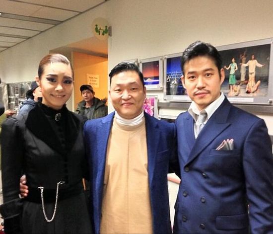 가수 싸이가 뮤지컬 '레베카'에 출연중인 배우 유준상과 옥주현을 방문해 의리를 과시했다.
