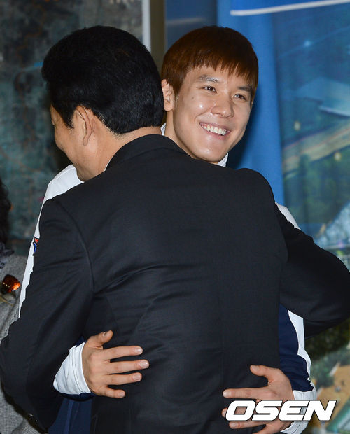 28일 오후 인천시청에서 진행된 인천시청 수영부 공식 입단식에서 박태환이 송영길 인천시장과 포옹을 하고 있다