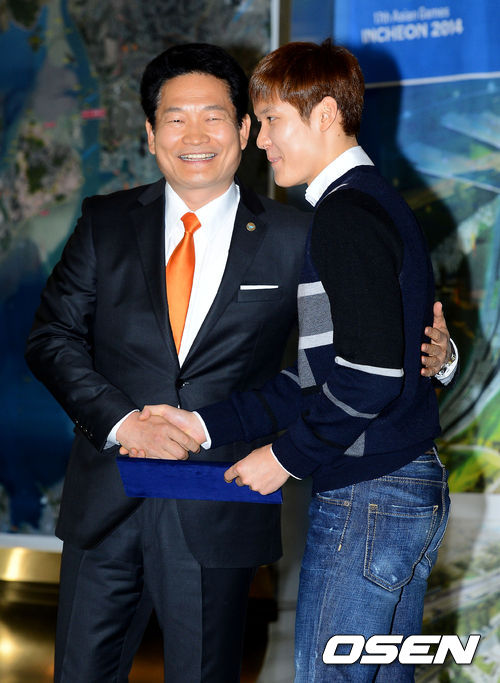 28일 오후 인천시청에서 진행된 인천시청 수영부 공식 입단식에서 박태환이 임명장을 전달받고 있다