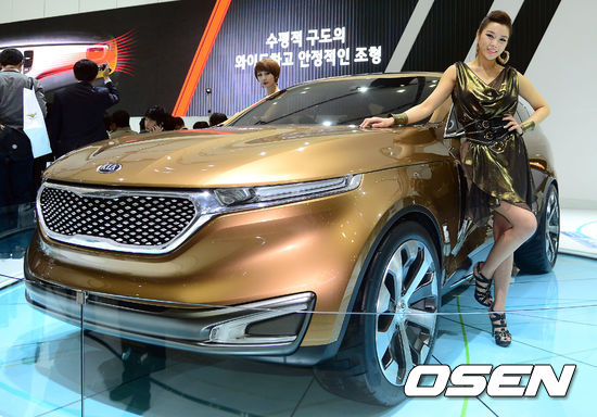 28일 일산 한국국제전시장(KINTEX, 이하 킨텍스)에서 열린 '2013서울모터쇼(Seoul Motor Show 2013)' 프레스데이에서 기아 콘셉트카 크로스 GT를 공개, 모델들이 차량을 선보이고 있다.
