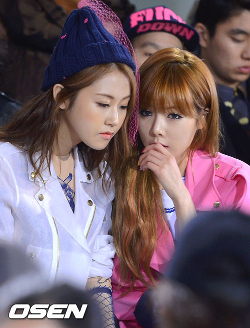 28일 오후 서울 여의도IFC에서 열린 '2013-14 F/W 서울패션위크' 계한희 패션쇼에 참석한 포미닛 멤버 허가윤과 현아가 이야기를 나누고 있다.