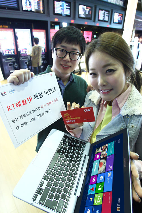 KT와 인텔코리아는 이동통신모듈을 탑재해 출시 예정인 삼성전자의 아티브(ATIV)와 HP의 엘리트패드(Elite pad) 900 등 아톰 기반 테블릿 2종을 체험행사를 서울 타임스퀘어에 위치한 CGV영등포에서 29일부터 3일간 운영한다고 밝혔다.