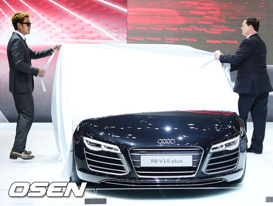 아우디 코리아 요하네스 타머 대표와 배우 하정우가 R8 V10을 공개하고 있다.