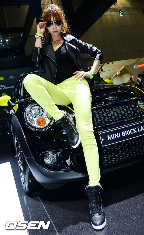 MINI 부스에서 레이싱걸 민다흰이 포즈를 취하고 있다.