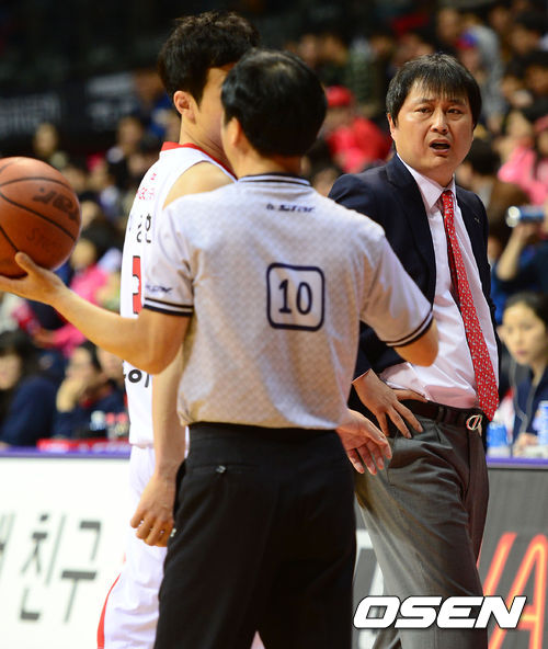 1쿼터 인삼공사 이상범 감독이 심판 판정에 불만을 나타내고 있다.