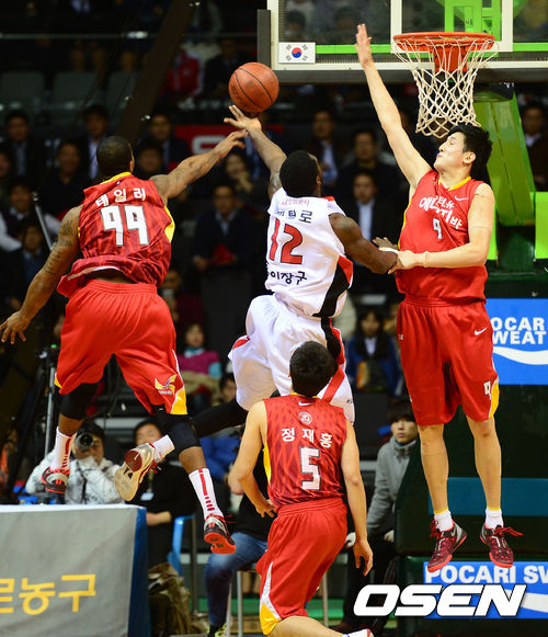 1쿼터 오리온스 테일러가 인삼공사 파틸로를 슛블록 하고 있다.