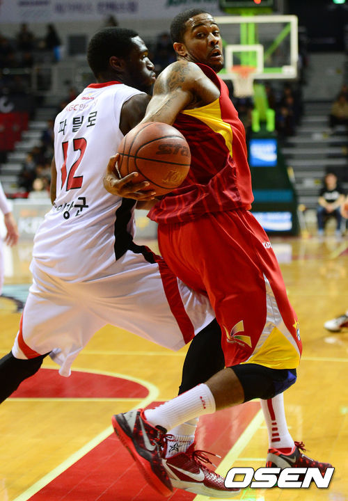 2쿼터 오리온스 테일러가 인삼공사 파틸로의 수비를 피해 돌파를 시도하고 있다.