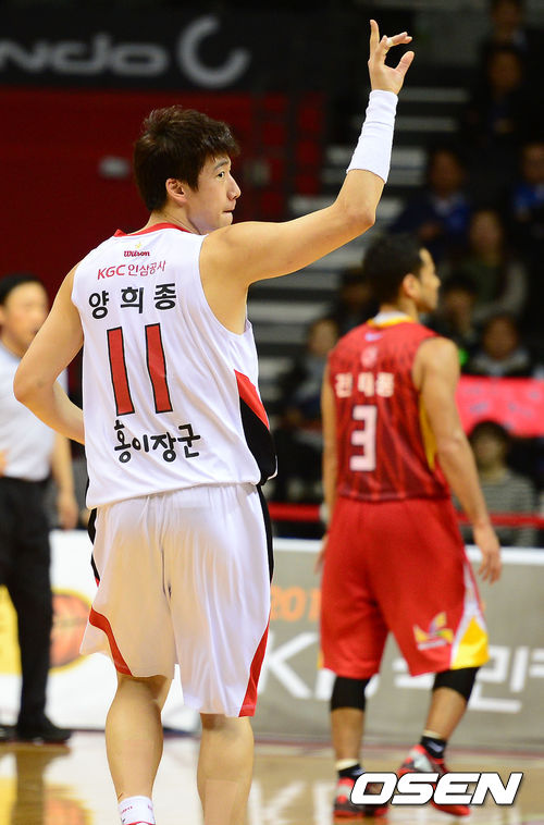 2쿼터 인삼공사 양희종이 3점슛을 성공시키고 기뻐하고 있다.