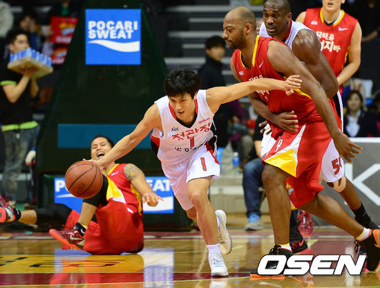 3쿼터 인삼공사 김태술이 오리온스 전태풍의 볼을 가로채고 드리블하고 있다.