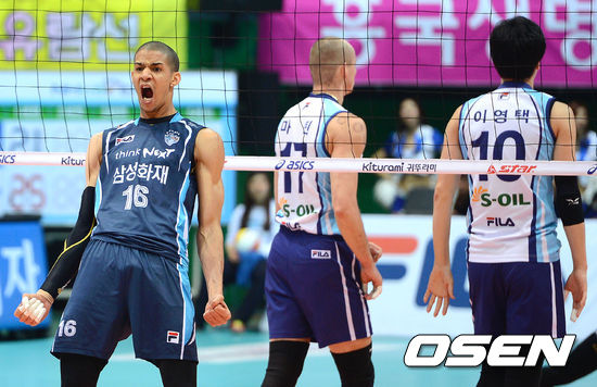 28일 오후 인천 도원체육관에서 열린 NH농협 2012~2013 V-리그 남자부 챔피언결정전 대한항공과 삼성화재의 3차전 경기 2세트 삼성화재 레오가 득점 성공 후 환호하고 있다