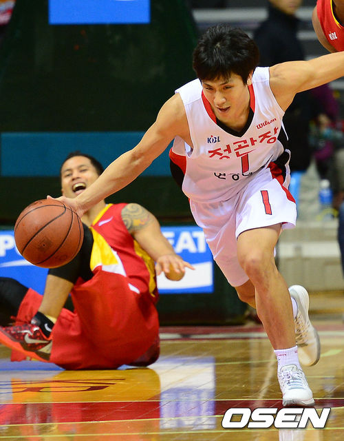 3쿼터 인삼공사 김태술이 오리온스 전태풍의 볼을 가로채 드리블하고 있다.