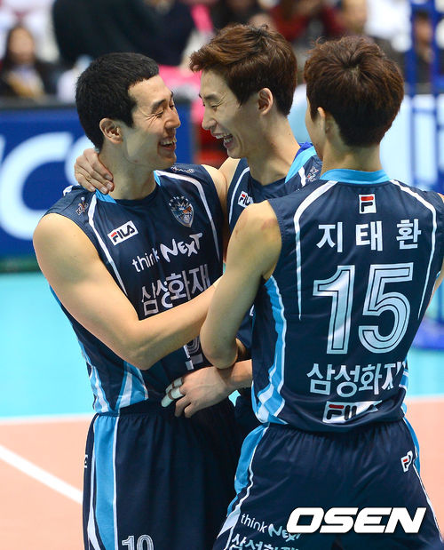 28일 오후 인천 도원체육관에서 열린 NH농협 2012~2013 V-리그 남자부 챔피언결정전 대한항공과 삼성화재의 3차전 경기, 2세트 종료 후 승리를 거둔 삼성화재 박철우와 고희진이 기쁨을 나누고 있다.