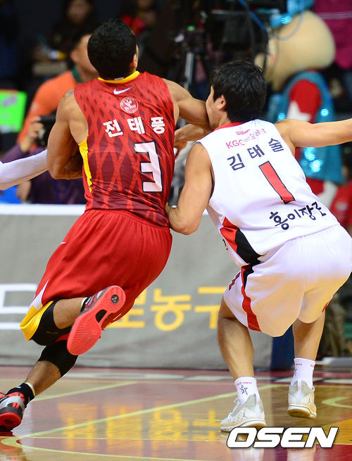 3쿼터 인삼공사 김태술이 오리온스 전태풍의 팔꿈치에 가격당하고 있다.