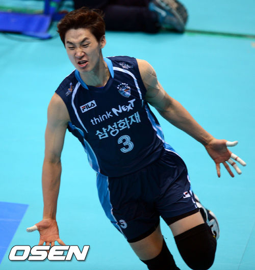 28일 오후 인천 도원체육관에서 열린 NH농협 2012~2013 V-리그 남자부 챔피언결정전 대한항공과 삼성화재의 3차전 경기, 1세트 삼성화재 박철우가 공격 성공후 환호하고 있다