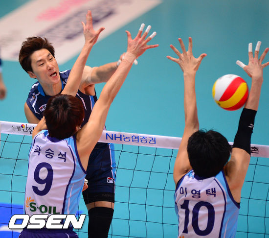 28일 오후 인천 도원체육관에서 열린 NH농협 2012~2013 V-리그 남자부 챔피언결정전 대한항공과 삼성화재의 3차전 경기,1세트 삼성화재 박철우가 강타를 날리고 있다