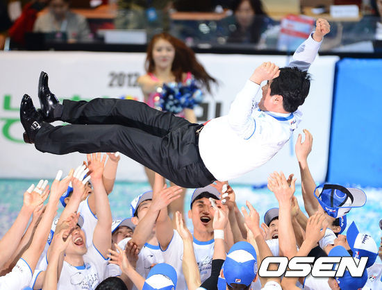 삼성화재 신치용 감독이 헹가래를 받고 있다./ soul1014@osen.co.kr