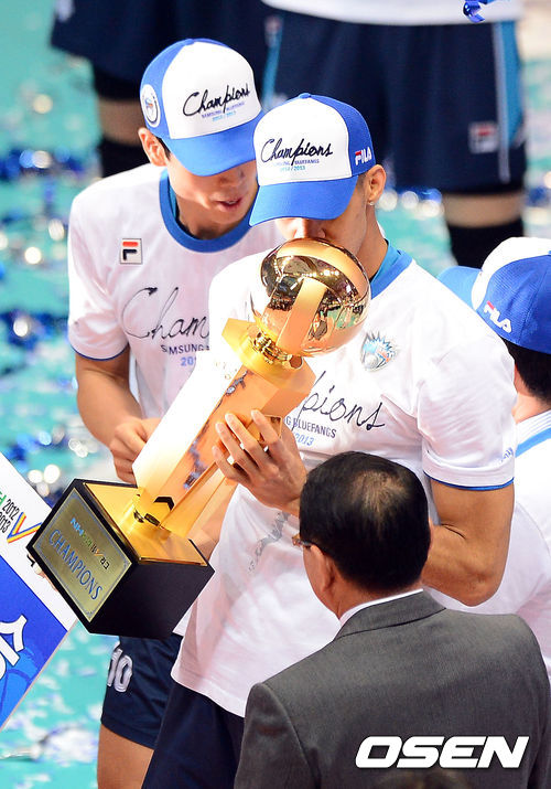 삼성화재 레오가 트로피에 키스를 하고 있다/ soul1014@osen.co.kr