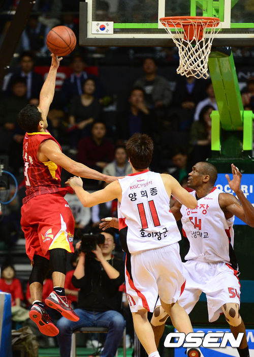 4쿼터 오리온스 전태풍이 인삼공사 양희종의 수비를 피해 슛을 성공시키고 있다. /jpnews@osen.co.kr