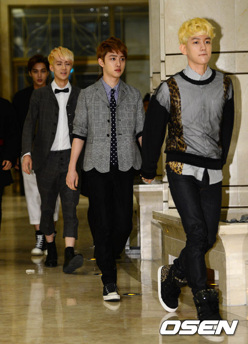 28일 오후 서울 중구 명동 에비뉴엘에서 열린 '10 꼬르소 꼬모 서울' 5주년 이벤트에서 EXO-K가 포토타임을위해 걸어오고 있다.
