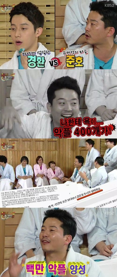 이어 김준호는 “허경환에 뭐라고 했더니 나한테 대들었다. 이 방송이 나가면 허경환이 욕을 먹을 것이라고 예상했다. 그런데 편집이 허경환 위주로 잘 나왔더라. 댓글에 내 욕만 400개였다. 악플에서 나를 향해 쓰레기 같은 놈이라고 했다”고 말해 웃음을 자아냈다.