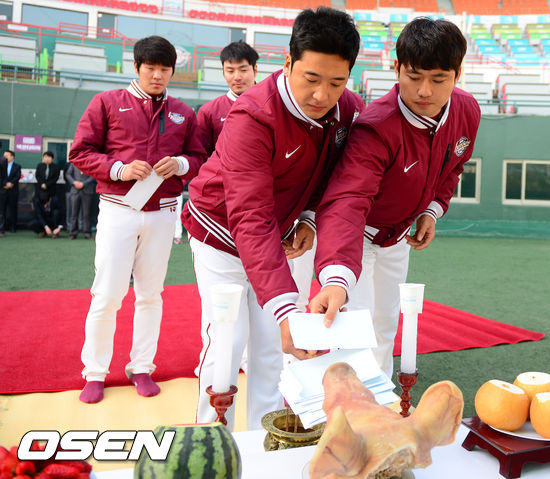 29일 오전 서울 목동구장에서 열린 넥센 히어로즈의 2013시즌 우승 및 안전 기원제에서 이택근과 손승락이 고사를 지내고 있다.