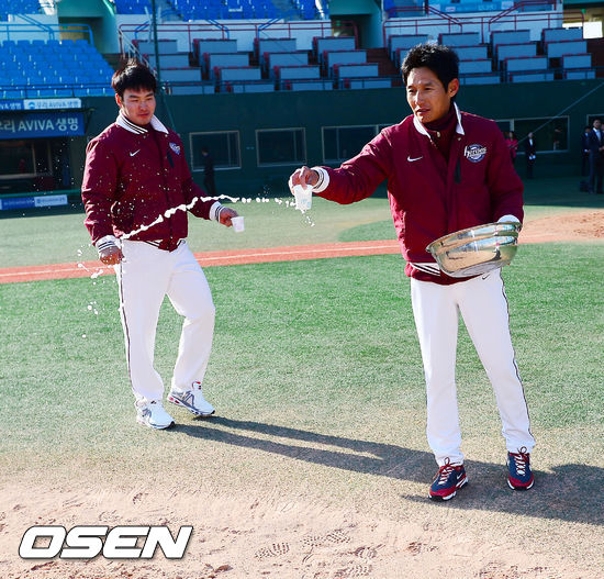 29일 오전 서울 목동구장에서 열린 넥센 히어로즈의 2013시즌 우승 및 안전 기원제에서 염경엽 감독이 마운드 위에 술을 뿌리고 있다.