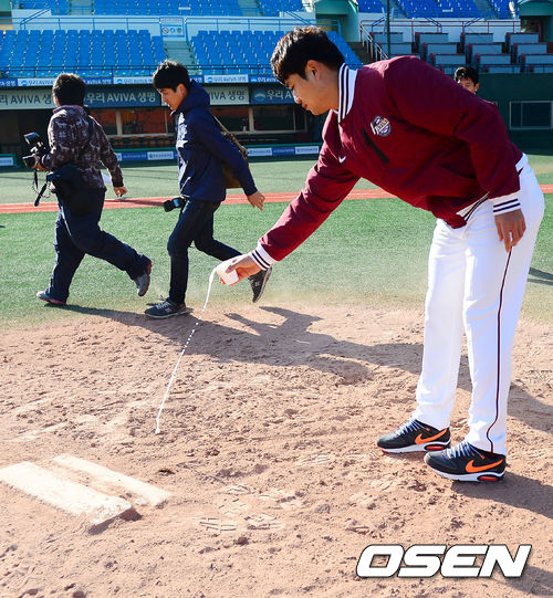 29일 오전 서울 목동구장에서 열린 넥센 히어로즈의 2013시즌 우승 및 안전 기원제에서 손승락이 마운드에 술을 뿌리고 있다.
