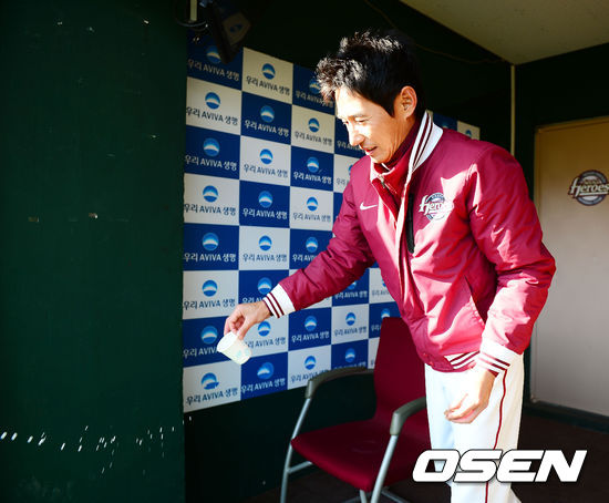 29일 오전 서울 목동구장에서 열린 넥센 히어로즈의 2013시즌 우승 및 안전 기원제에서 염경엽 감독이 감독석에 술을 뿌리고 있다.