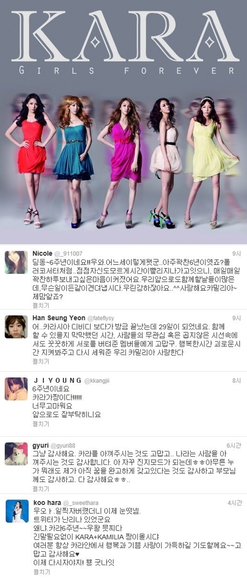 그룹 카라의 멤버들이 데뷔 6주년을 기념해 각각의 트위터에 소감을 남겼다.
