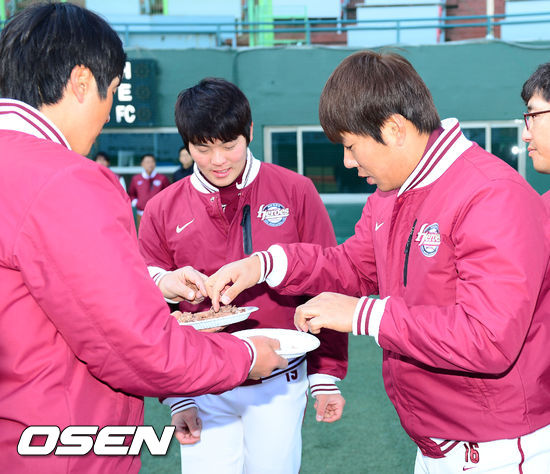 29일 오전 서울 목동구장에서 열린 넥센 히어로즈의 2013시즌 우승 및 안전 기원제에서 강정호가 떡을 나누고 있다.