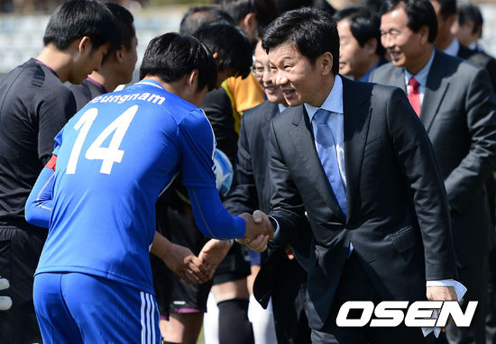 29일 경상북도 경산 영남대학교에서 열린 '2013 카페베네 U리그' 개막전 영남대와 부경대의 경기, 경기에 앞서 정몽규 대한축구협회 회장이 선수들을 격려하고 있다.