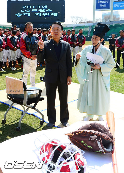 29일 오후 서울 잠실구장에서 열린 LG 트윈스의 2013시즌 승리 및 안전 기원제에서 LG 트윈스 전진우 사장이 축문을 태워 날리고 있다.