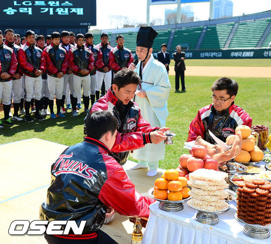 이 자리에는 김기태 감독 이하 선수단 전원이 참석해 올 시즌 선수단의 무사안녕과 승리를 기원하는 '승리기원제'를 지냈다.