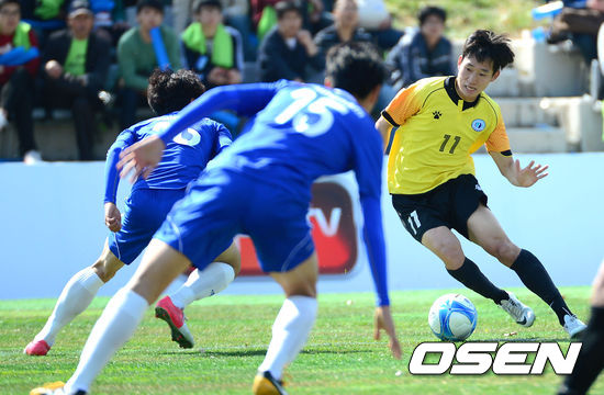 29일 경상북도 경산 영남대학교에서 열린 '2013 카페베네 U리그' 개막전 영남대와 부경대의 경기, 전반전 부경대 김종혁이 드리블 돌파를 하고 있다.