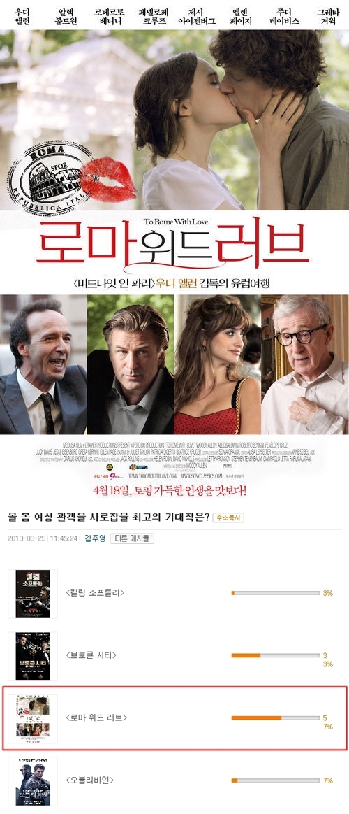 '로마 위드 러브'는 지난 25일 포털사이트 네이트에서 진행된 '올 봄 여성 관객을 사로잡을 최고의 기대작'이라는 제목의 설무조사에서 57%의 지지율로 1위에 올랐다. 그 뒤를 '브로큰 시티'(33%), '오블리비언'(7%), '킬링 소프틀리'(3%)가 나란히 이었다.