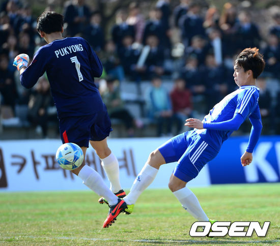 29일 경상북도 경산 영남대학교에서 열린 '2013 카페베네 U리그' 개막전 영남대와 부경대의 경기, 후반전 영남대 장순규가 역전골을 성공시키고 있다.