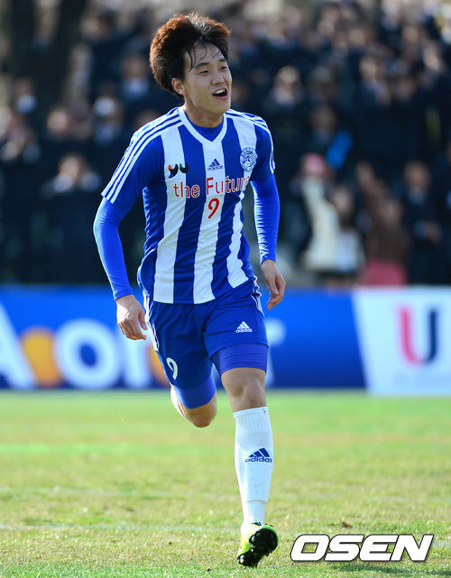 29일 경상북도 경산 영남대학교에서 열린 '2013 카페베네 U리그' 개막전 영남대와 부경대의 경기, 후반전 영남대 장순규가 역전골을 성공시키고 환호하고 있다.