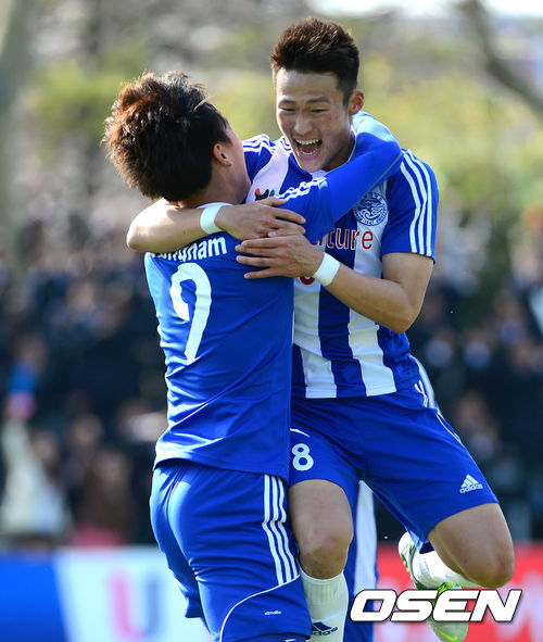 29일 경상북도 경산 영남대학교에서 열린 '2013 카페베네 U리그' 개막전 영남대와 부경대의 경기, 후반전 영남대 장순규가 역전골을 성공시키고 동료들의 축하를 받고 있다.