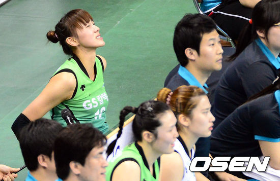 29일 오후 경북 구미 박정희체육관에서 열린 '2012-2013 NH농협 V리그' 여자부 챔피언결정전 4차전 IBK기업은행과 GS칼텍스의 경기, 1세트 다리 부상으로 코트를 빠져나간 GS칼텍스 한송이가 아쉬운 표정을 짓고 있다.